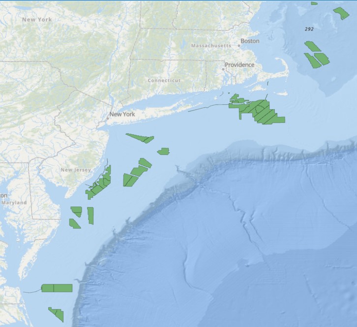 Description: Outlines of Active renewable energy leasing areas on the Atlantic OCS.